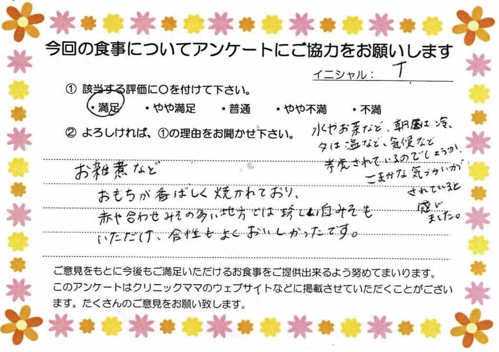 彩りも栄養バランスもよく考えられており、目も口も美味しくいただきました。産後数時間後、一人で心細かったのですが、レストランスタッフさんがとても笑顔で配膳してくださって、心があたたまりました。ありがとうございました。