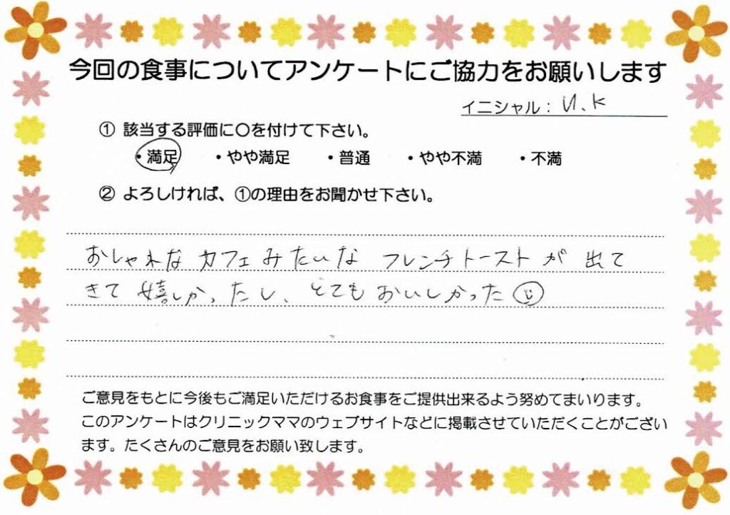 フレンチトーストがフワフワでとってもおいしかったです。ヨーグルトにも果物が入っていて色々たべれて満足です。
