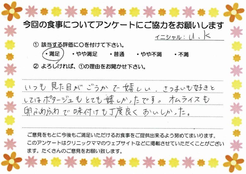 ランチやディナーに通いたくなるメニューばかりで幸せでした。おいしい料理をたくさんいただき元気になったので、退院後の子育て頑張れそうです♢( 毎日、お部屋まで運んで下さりありがとうございました。 )