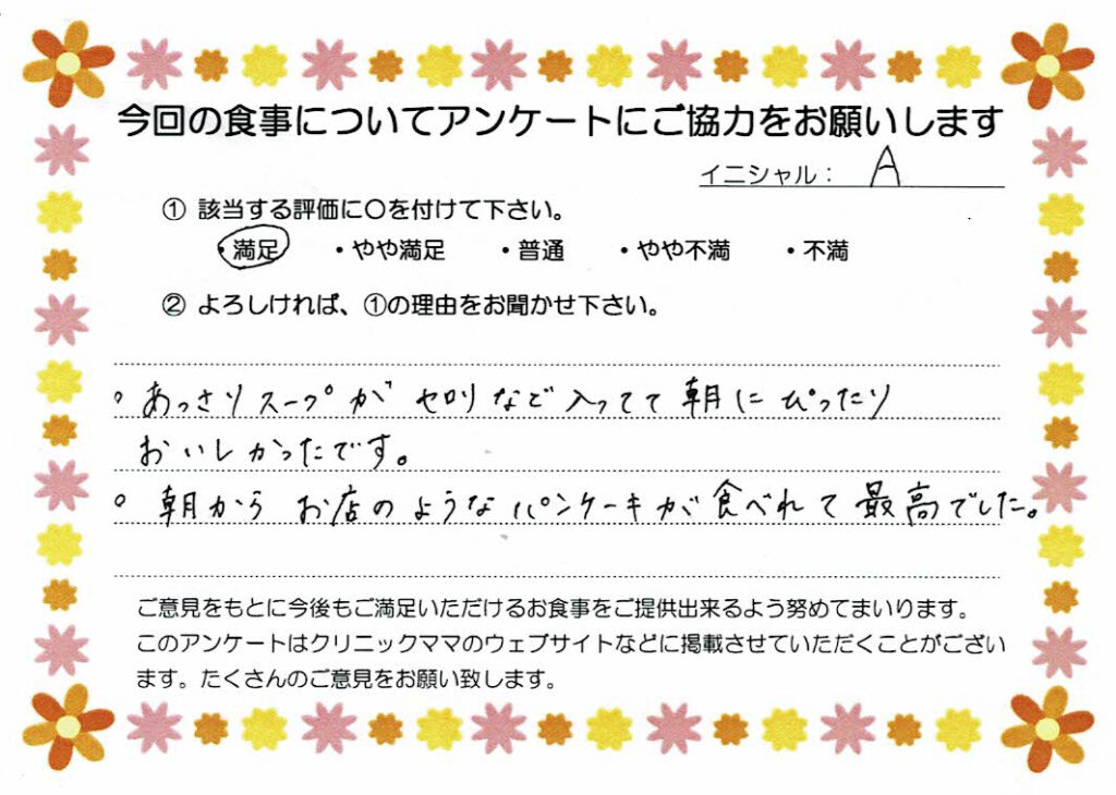 ホテル朝食みたいでテンションあがります。スープが特においしかったです。