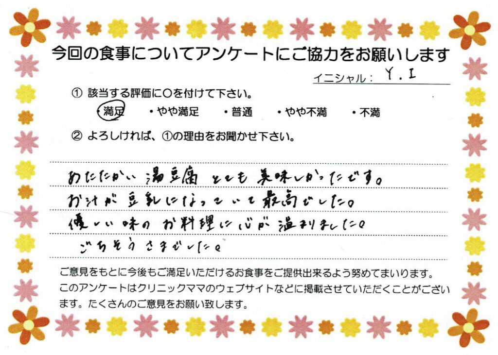 毎回美味い食事、ありがとうございました。毎回栄養バランスを考えられた食事、ありきたりな献立だけでなく普段口にする事がないようなものまで最後の最後まで楽しく、そして美味しかったです!これからの育児頑張れそうです!!また、楽しみにしていますね。( 家族が増える際には )