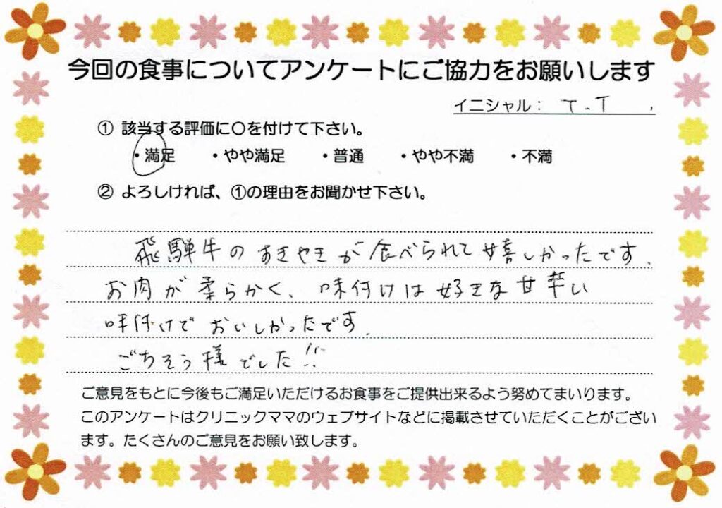 いつも美味しいお食事ありがとうございました。これで最後と思うと寂しいですが、味わって食べました!好き嫌いのことを配慮して下さったり、いつも親切に声をかけて下さって、本当にありがとうございました。お世話になりました。