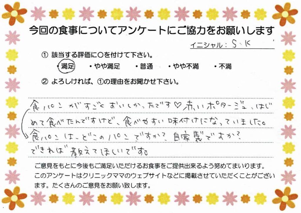 パンが大好きなので、ふわふわの食パンが食べられて嬉しかったです。産後ハイ状態でほとんど眠れなかったのですが、朝食を食べて元気が出ました♡ 苦手な野菜もおいしく食べられました。ありがとうございました。