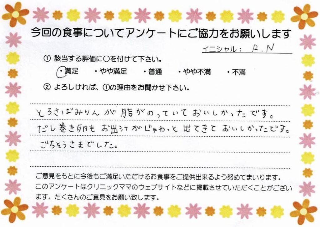 フレンチトーストがとてもおいしくて中がフワフワでシロップをかけてたべたらとてもおいしかったです!!普段は朝からやさいを食べることがあまりなかったので、退院後も引き続きやさいも取り入れていこうと思います。おいしかったです!!
