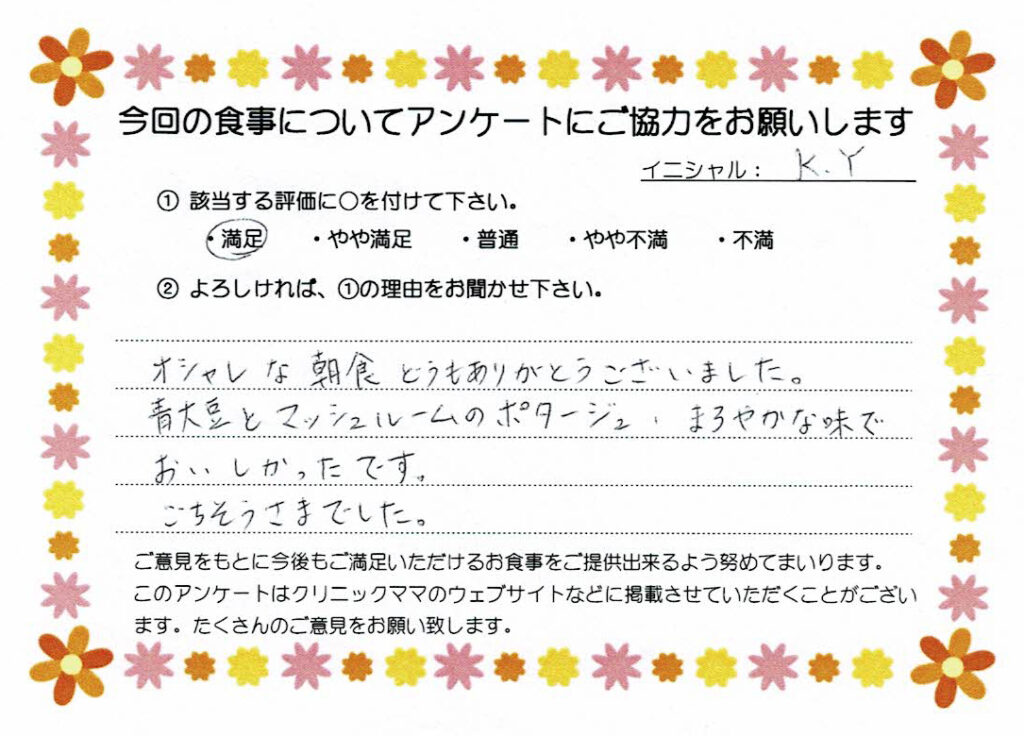 産後数時間後の夕飯でしたが、体にも心にもしみておいしくて感動しました。見た目もごうかで、おいしく涙がでました。レストランの配膳スタッフさんが産後すぐで動けないため色々気をつかって声をかけて頂きありがたかったです。